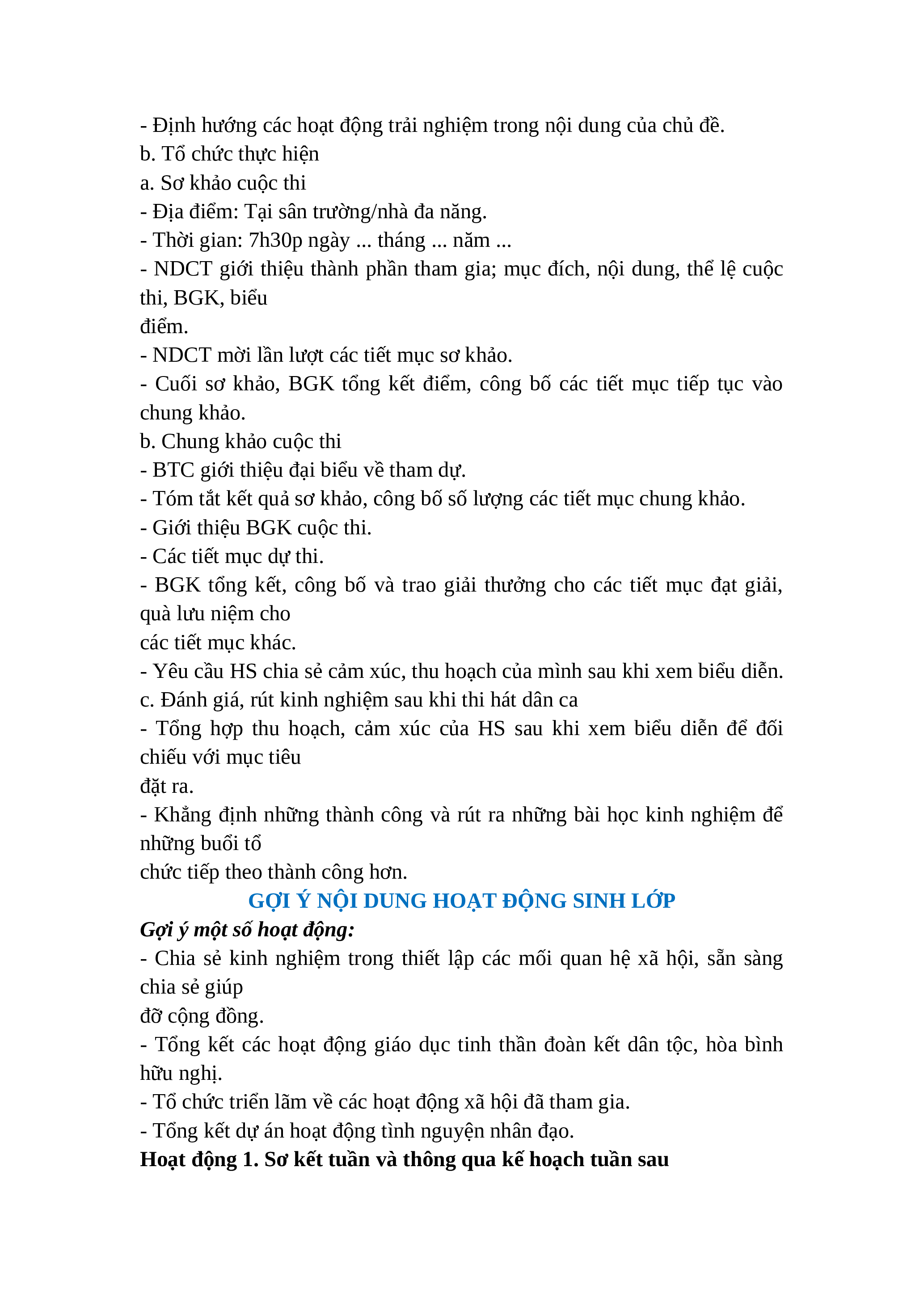 - Định hướng các hoạt động trải nghiệm trong nội dung của chủ đề. b. Tổ chức thực hiện a. Sơ khảo cuộc thi