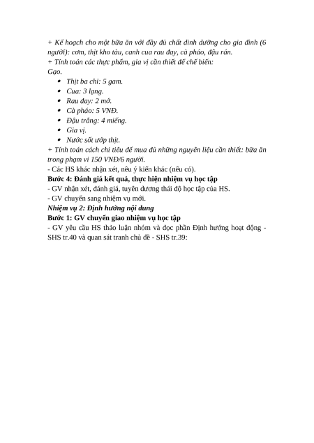 + Lên kế hoạch cho một bữa ăn với đầy đủ chất dinh dưỡng cho gia đình (6 người).