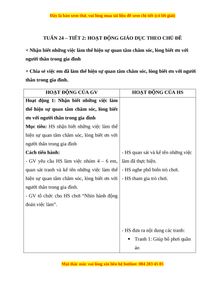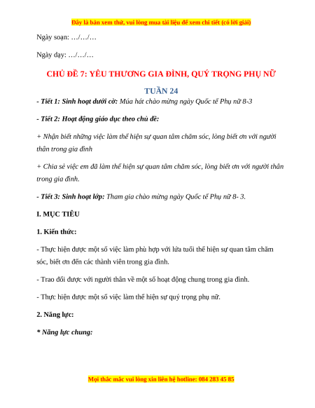 CHỦ ĐỀ 7: YÊU THƯƠNG GIA ĐÌNH, QUÝ TRỌNG PHỤ NỮ TUẦN 24
