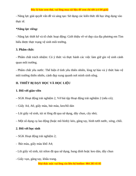 - Phẩm chất trách nhiệm: Có ý thức và thực hành các việc làm giữ gìn vệ sinh cảnh quan môi trường.