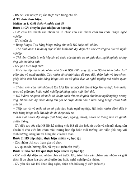 - GV chia HS thành các nhóm và tổ chức cho các nhóm chơi trò chơi Bingo nghề nghiệp. - GV chuẩn bị: