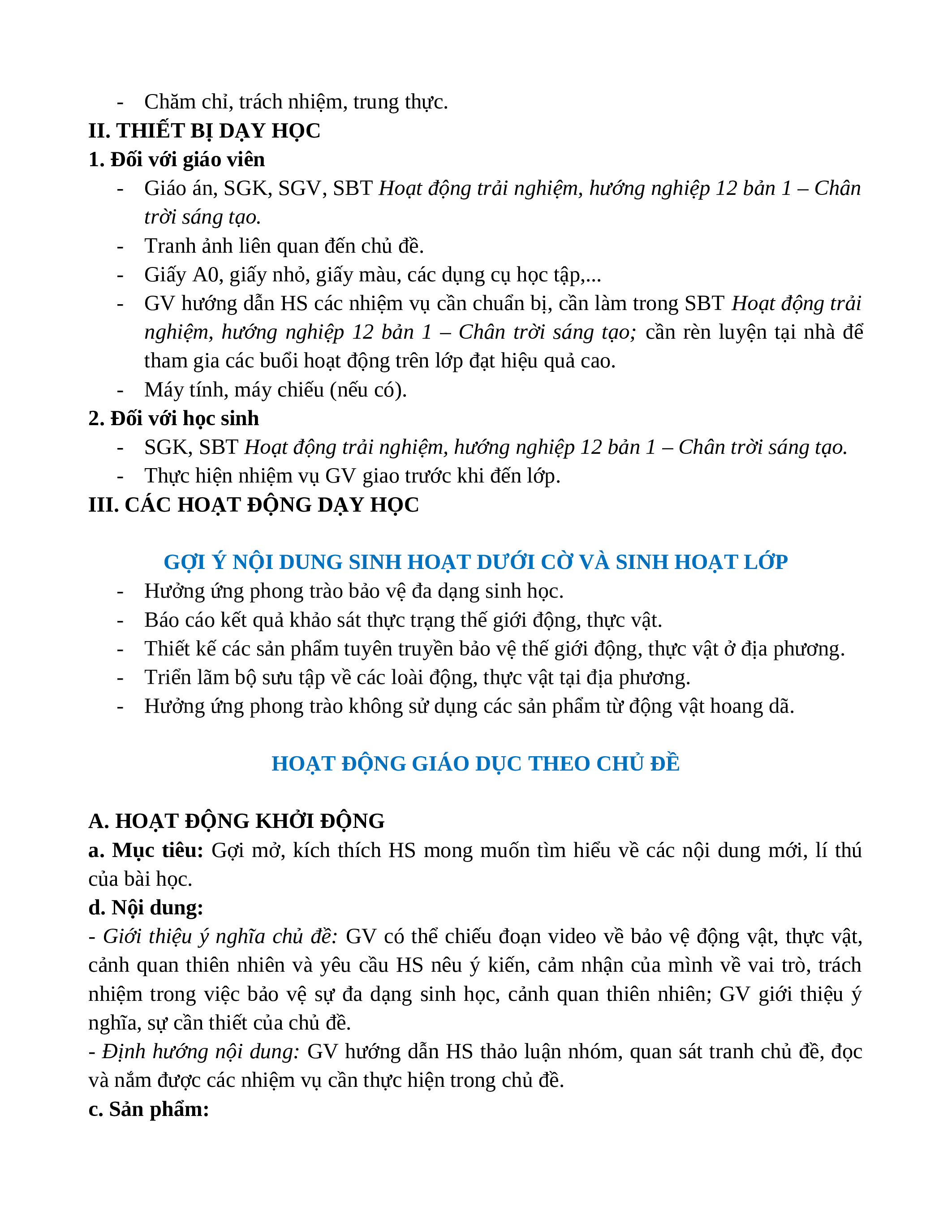 Giáo án Chủ đề 9: Bảo vệ cảnh quan thiên nhiên, thế giới động vật và thực vật HĐTN 12 Chân trời sáng tạo