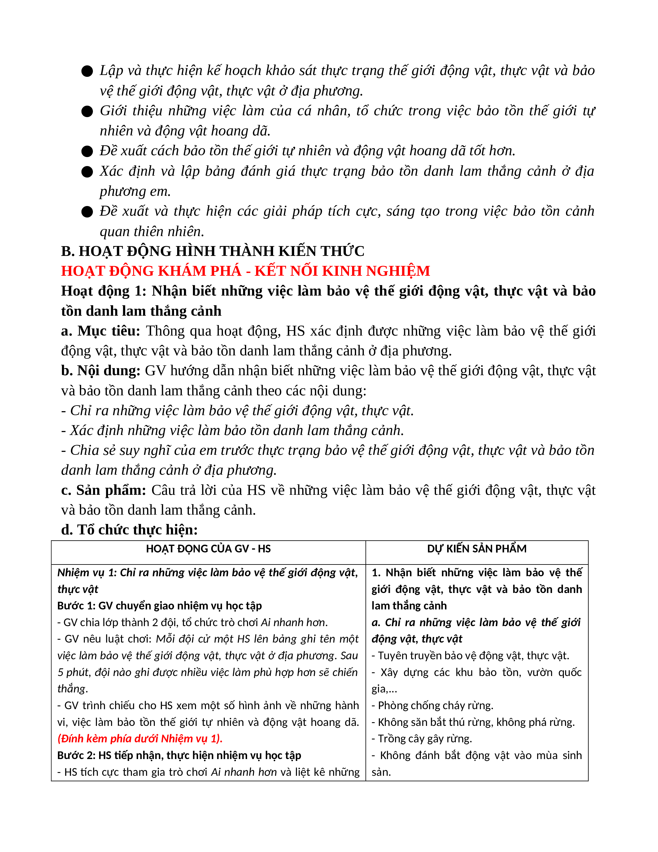 THẾ GIỚI ĐỘNG VẬT VÀ THỰC VẬT I. MỤC TIÊU 1. Kiến thức