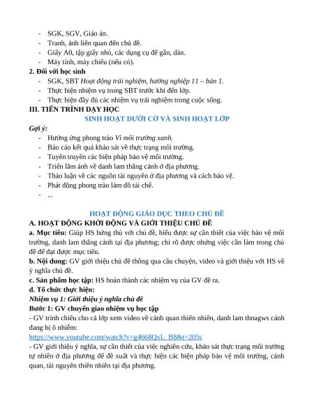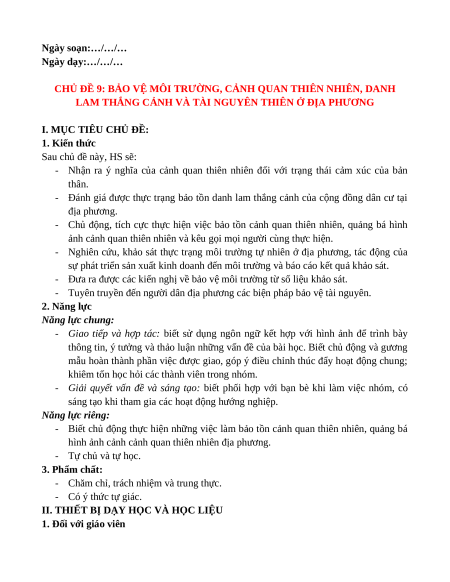 Giáo án Chủ đề 9: Bảo vệ môi trường, cảnh quan thiên nhiên, danh lam thắng cảnh và tài nguyên địa phương HĐTN 11 Chân trời sáng tạo