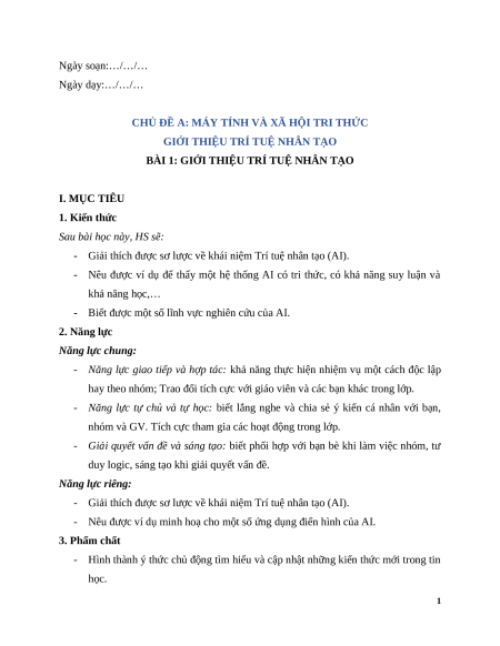 BÀI 1: GIỚI THIỆU TRÍ TUỆ NHÂN TẠO I. MỤC TIÊU 1. Kiến thức