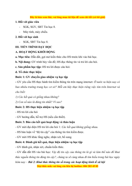 Đây là bản xem thử, vui lòng mua tài liệu để xem chi tiết (có lời giải) 1. Đối với giáo viên - SGK, SGV, SBT Tin học 8. - Máy tính, máy chiếu. 2. Đối với học sinh - SGK, SBT Tin học 8.