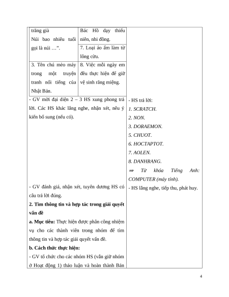 - Năng lực giải quyết vấn đề sáng tạo: HS đưa ra các phương án trả lời cho câu