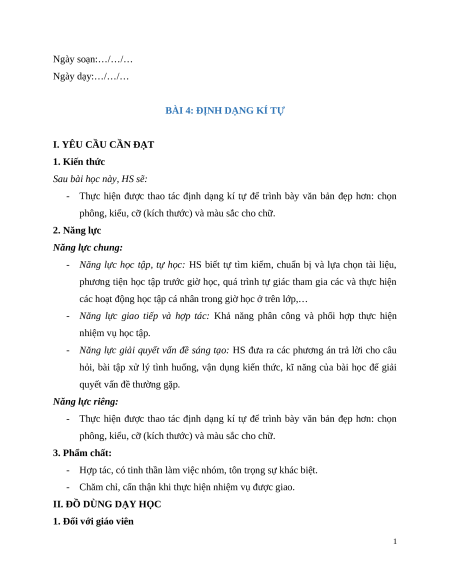 phông, kiểu, cỡ (kích thước) và màu sắc cho chữ. 3. Phẩm chất: