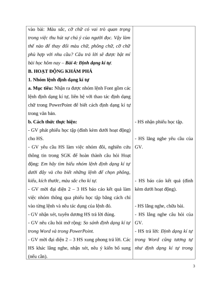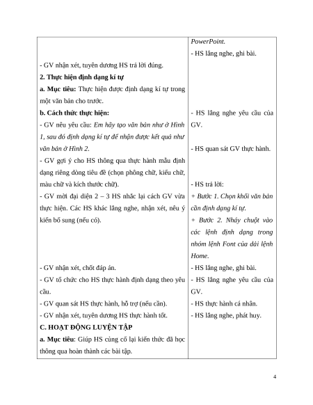 HS khác lắng nghe, nhận xét, nêu ý kiến bổ sung như định dạng kí tự trong (nếu cần). 3 PowerPoint. - HS lắng nghe, ghi bài.