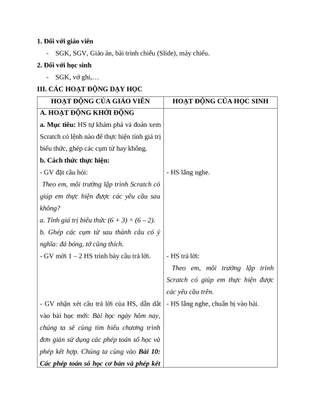Giáo án Chủ đề F Bài 10 Tin học lớp 5 Cánh diều: Các phép toán số học cơ bản và phép kết hợp