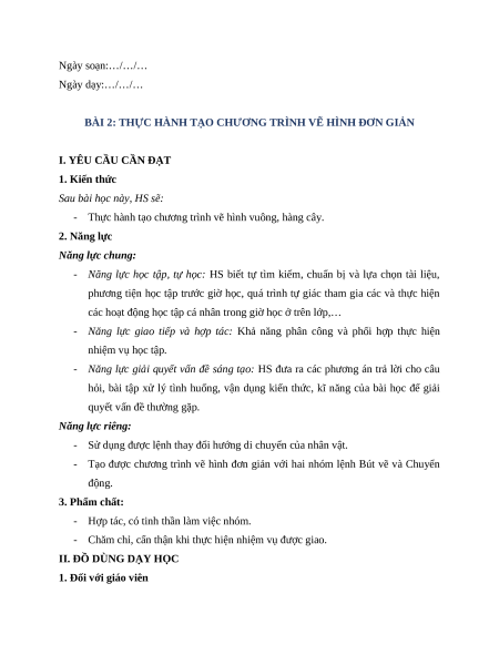 - Tạo được chương trình vẽ hình đơn giản với hai nhóm lệnh Bút vẽ và Chuyển động. 3. Phẩm chất: