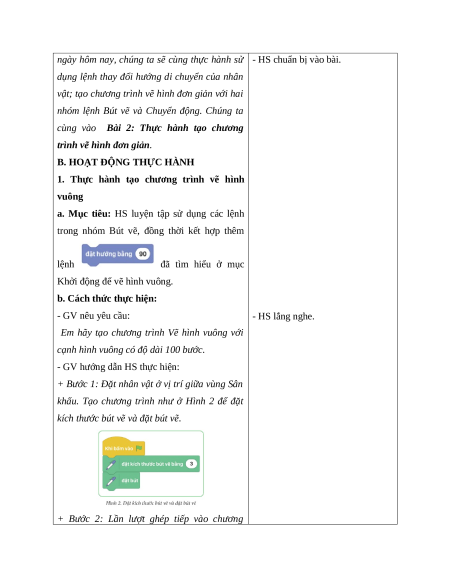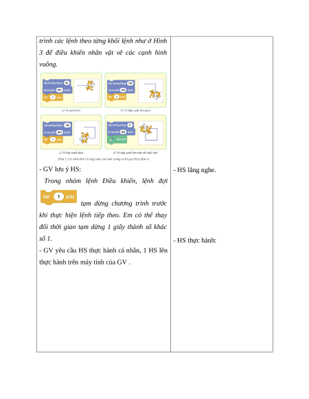 3 để điều khiển nhân vật vẽ các cạnh hình vuông. - GV lưu ý HS: - HS lắng nghe.
