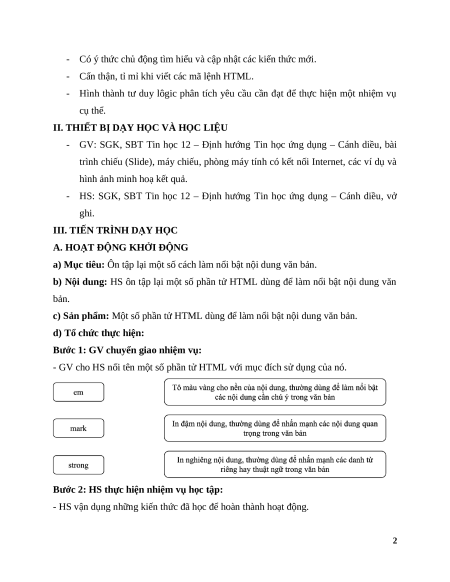 b) Nội dung: HS ôn tập lại một số phần tử HTML dùng để làm nổi bật nội dung văn bản.