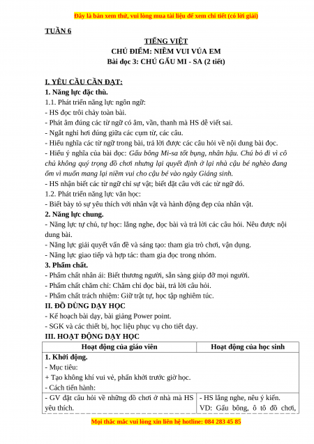 Bài đọc 3: CHÚ GẤU MI - SA (2 tiết) I. YÊU CẦU CẦN ĐẠT: 1. Năng lực đặc thù.