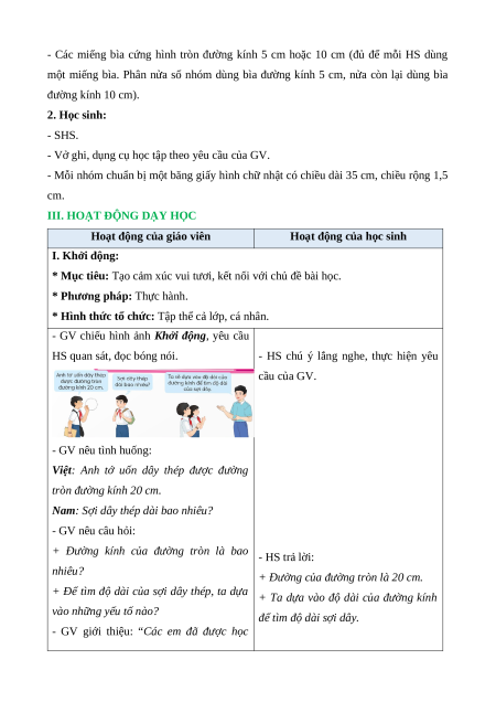 một miếng bìa. Phân nửa số nhóm dùng bìa đường kính 5 cm, nửa còn lại dùng bìa đường kính 10 cm). 2. Học sinh: - SHS.