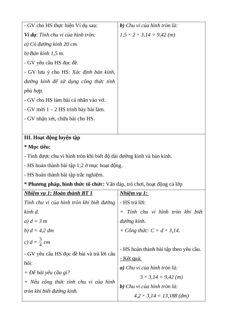 Trong đó, C là chu vi; d và r lần lượt là - Kết quả: