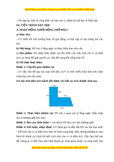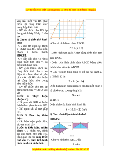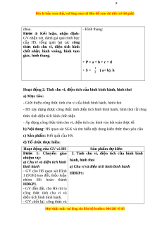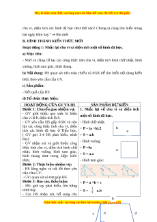 ứ : Sau khi h c ọ xong bài này HS - Hi u ể và ghi nhớ đư c ợ công th c ứ tính chu vi, di n ệ tích c a ủ m t ộ số hình đã h c. ọ 2. Năng l c ự - Năng l c ri ự êng: + Gi i ả quy t ế đư c ợ m t ộ s v ố n đ ấ t ề h c t ự i n g ễ n ắ v i ớ vi c t ệ ính chu vi, di n t ệ ích c a m ủ t ộ số t gi ứ ác đã h c. ọ - Năng l c ự chung: Năng l c ự tư duy và l p ậ lu n ậ toán h c; ọ mô hình hóa toán h c; ọ năng l c ự gi i ả quy t ế v n đ ấ t ề oán h c, gi ọ ao ti p t ế oán h c. ọ 3. Ph m ẩ chất - Ph m ẩ ch t ấ : Bồi dư ng ỡ trí tư ng ở tư ng, ợ h ng ứ thú h c ọ t p, ậ ý th c ứ làm vi c ệ nhóm, ý th c t