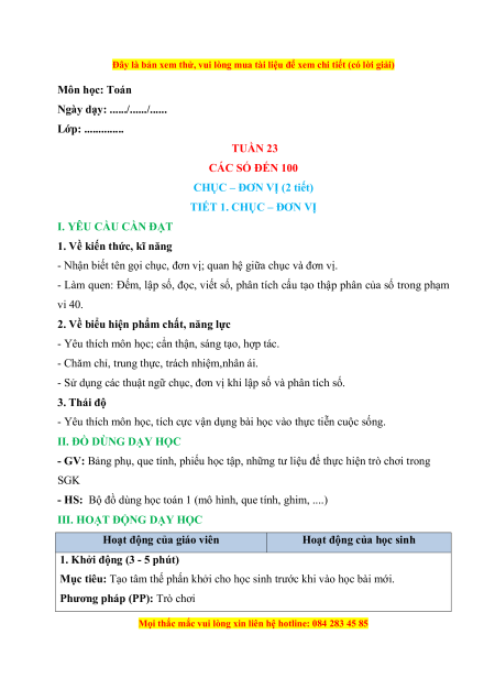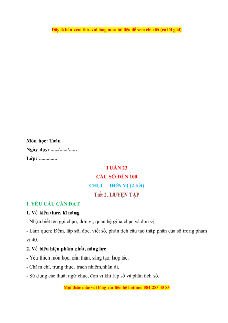 Ngày dạy: ....../....../...... Lớp: .............. TUẦN 23 CÁC SỐ ĐẾN 100