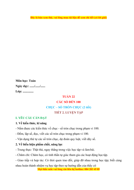 Ngày dạy: ....../....../...... Lớp: .............. TUẦN 22 CÁC SỐ ĐẾN 100