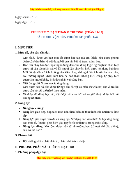 BÀI 1: CHUYỆN CỦA THƯỚC KẺ (TIẾT 1-4) I. MỤC TIÊU
