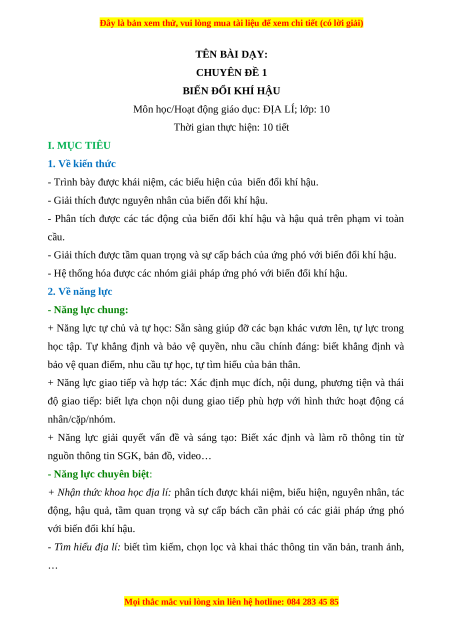 Giáo án chuyên đề 1 Biến đổi khí hậu Địa lí 10 Cánh diều