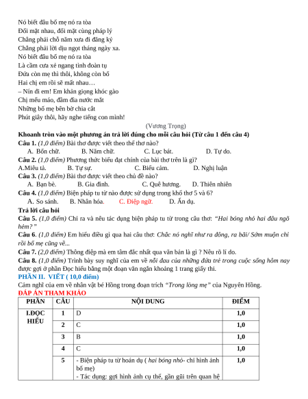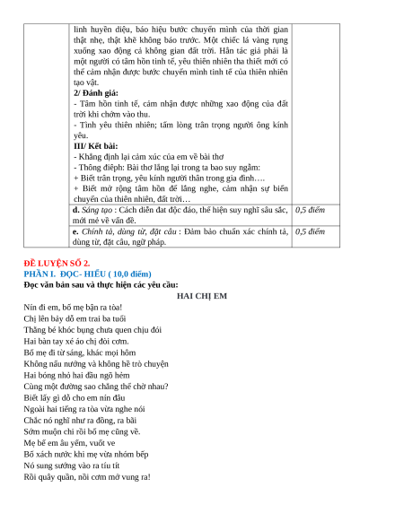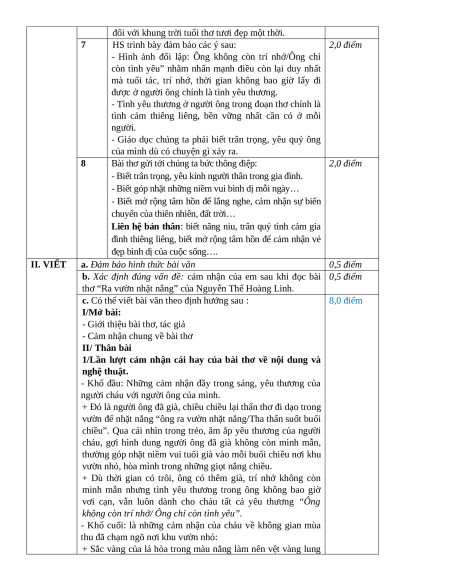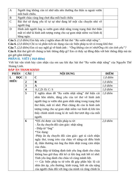 Viết bài văn trình bày cảm nhận của em sau khi đọc bài thơ “Ra vườn nhặt nắng” của Nguyễn Thế Hoàng Linh. ĐÁP ÁN THAM KHẢO PHẦN CÂU NỘI DUNG ĐIỂM I. ĐỌC 1 C 1,0 điểm HIỂU 2 B 1,0 điểm 3 A 1,0 điểm 4 A,C,D: Đ; C: S 1,0 điểm 5