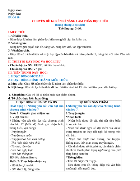 Giáo án Chuyên đề 14. Rèn kĩ năng làm phần đọc hiểu