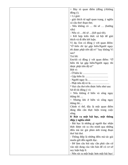 nội dung chính; cách hiểu một câu thơ, đoạn thơ; bày tỏ quan điểm và lí giải tại sao; những thông điệp