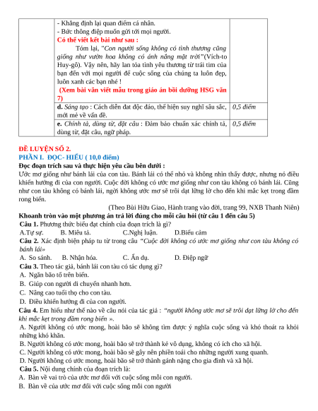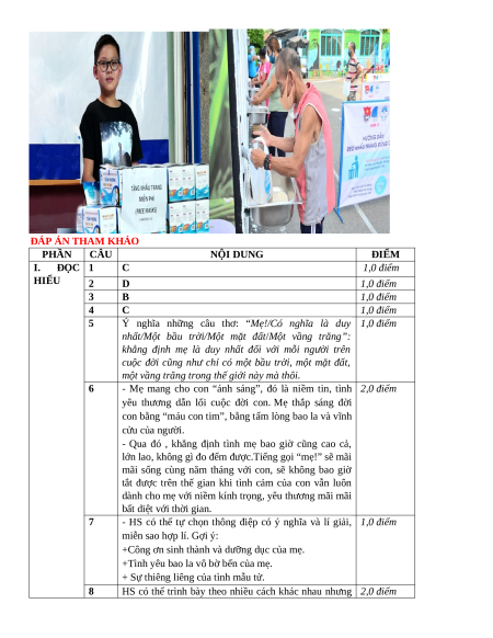 thi ) bày tỏ suy nghĩ của em. ĐÁP ÁN THAM KHẢO PHẦN CÂU NỘI DUNG ĐIỂM I. ĐỌC 1 C 1,0 điểm HIỂU 2 D 1,0 điểm 3 B 1,0 điểm 4 C 1,0 điểm 5