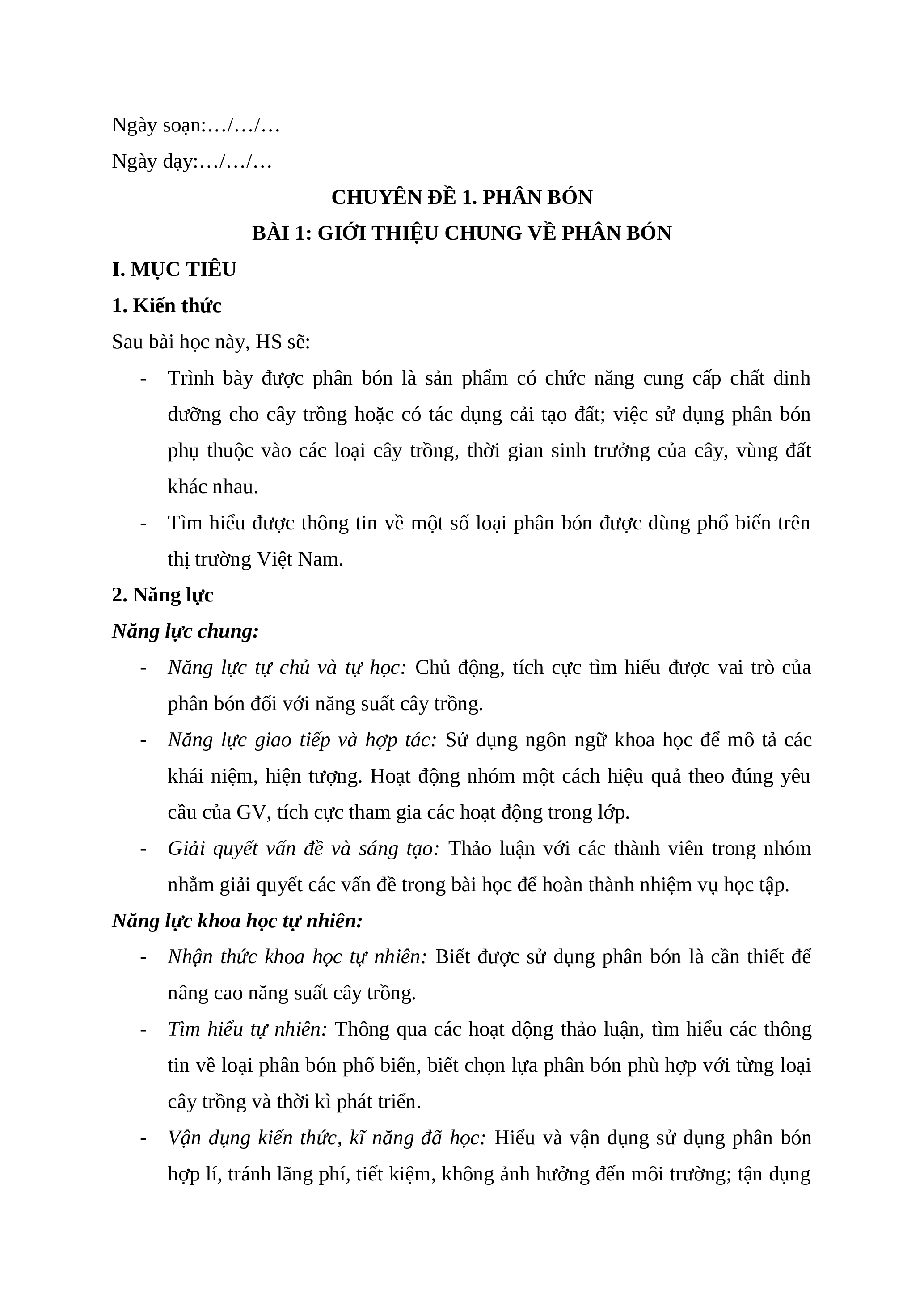 BÀI 1: GIỚI THIỆU CHUNG VỀ PHÂN BÓN I. MỤC TIÊU 1. Kiến thức Sau bài học này, HS sẽ: