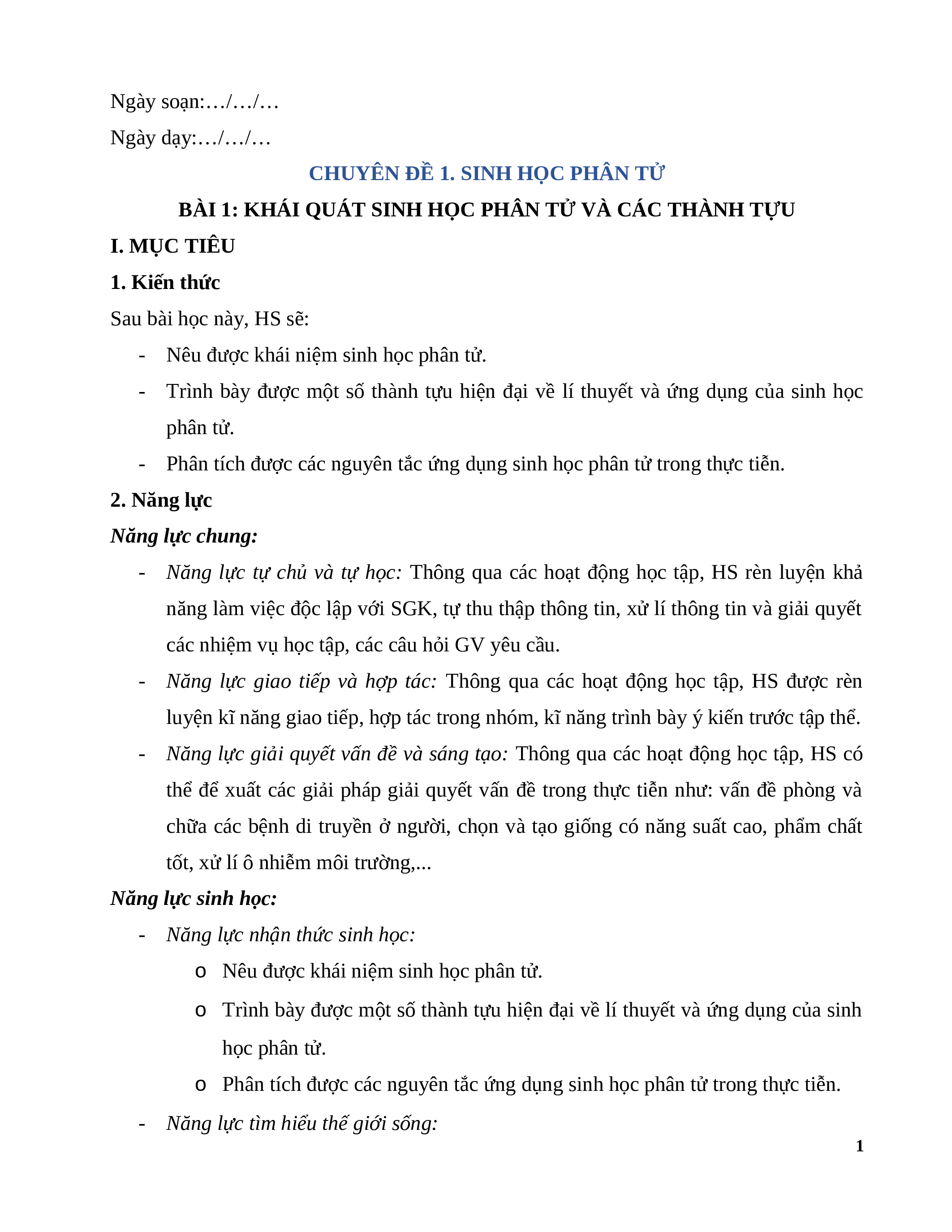 BÀI 1: KHÁI QUÁT SINH HỌC PHÂN TỬ VÀ CÁC THÀNH TỰU I. MỤC TIÊU 1. Kiến thức Sau bài học này, HS sẽ: