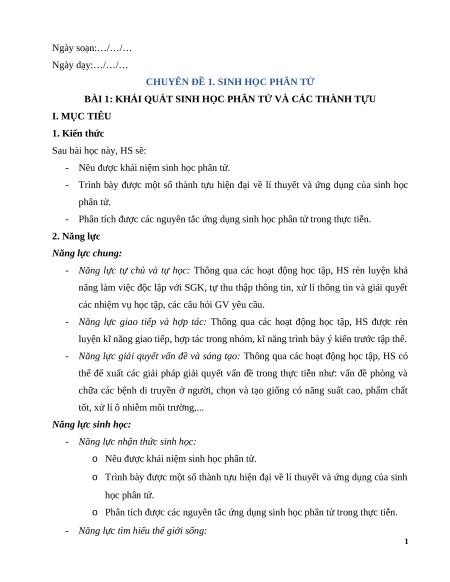 Giáo án chuyên đề Bài 1: Khái quát sinh học phân tử và thành tựu Sinh học 12 Kết nối tri thức