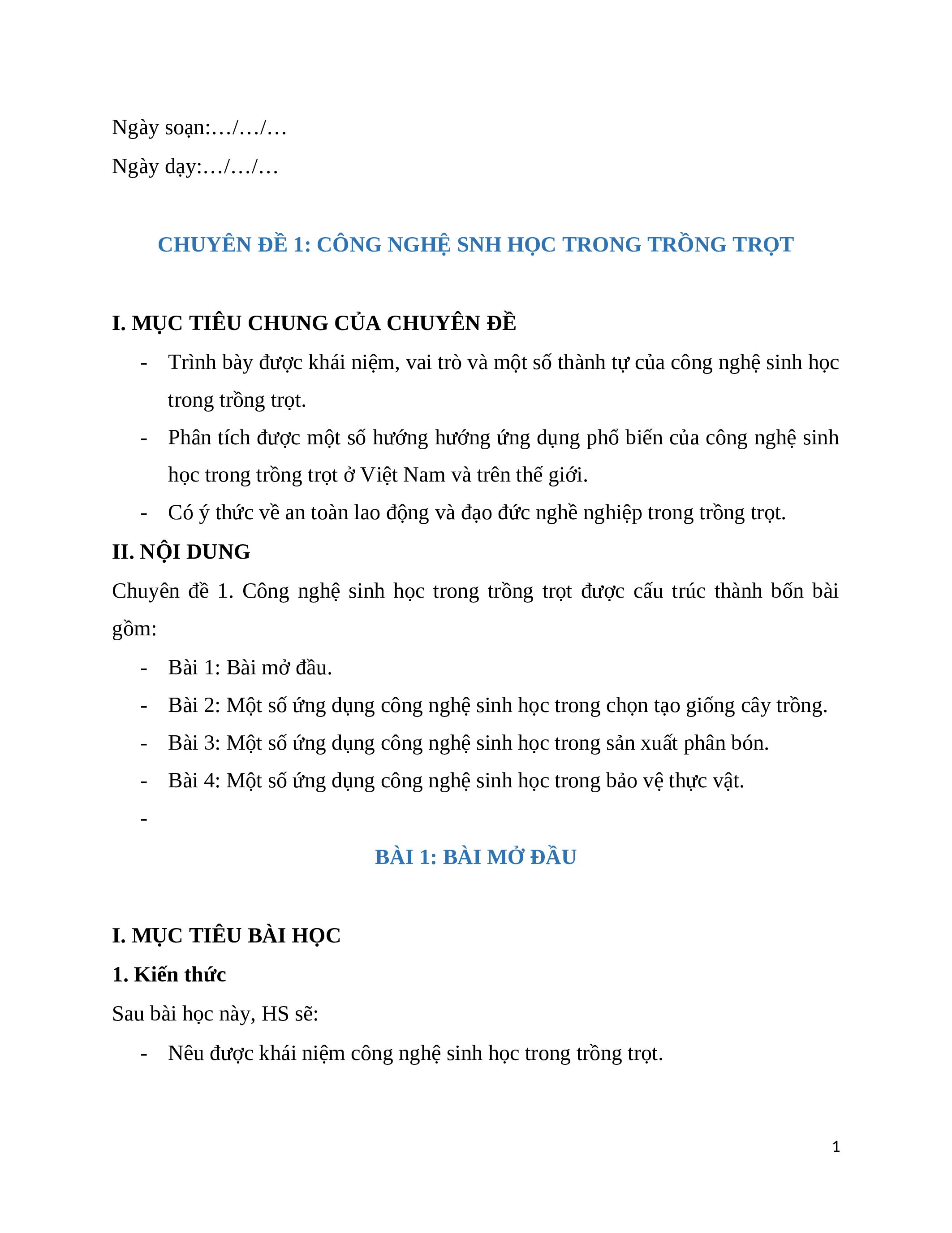 - Nêu được khái niệm công nghệ sinh học trong trồng trọt. 1