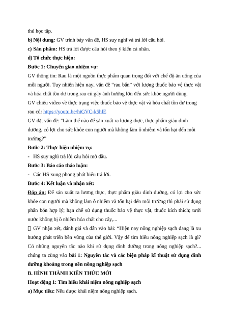 - Nhận thức sinh học: Nêu được khái niệm nông nghiệp sạch.