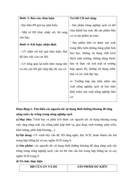 c) Sản phẩm: Khái niệm nông nghiệp sạch, câu trả lời cho câu hỏi trong hộp Dừng