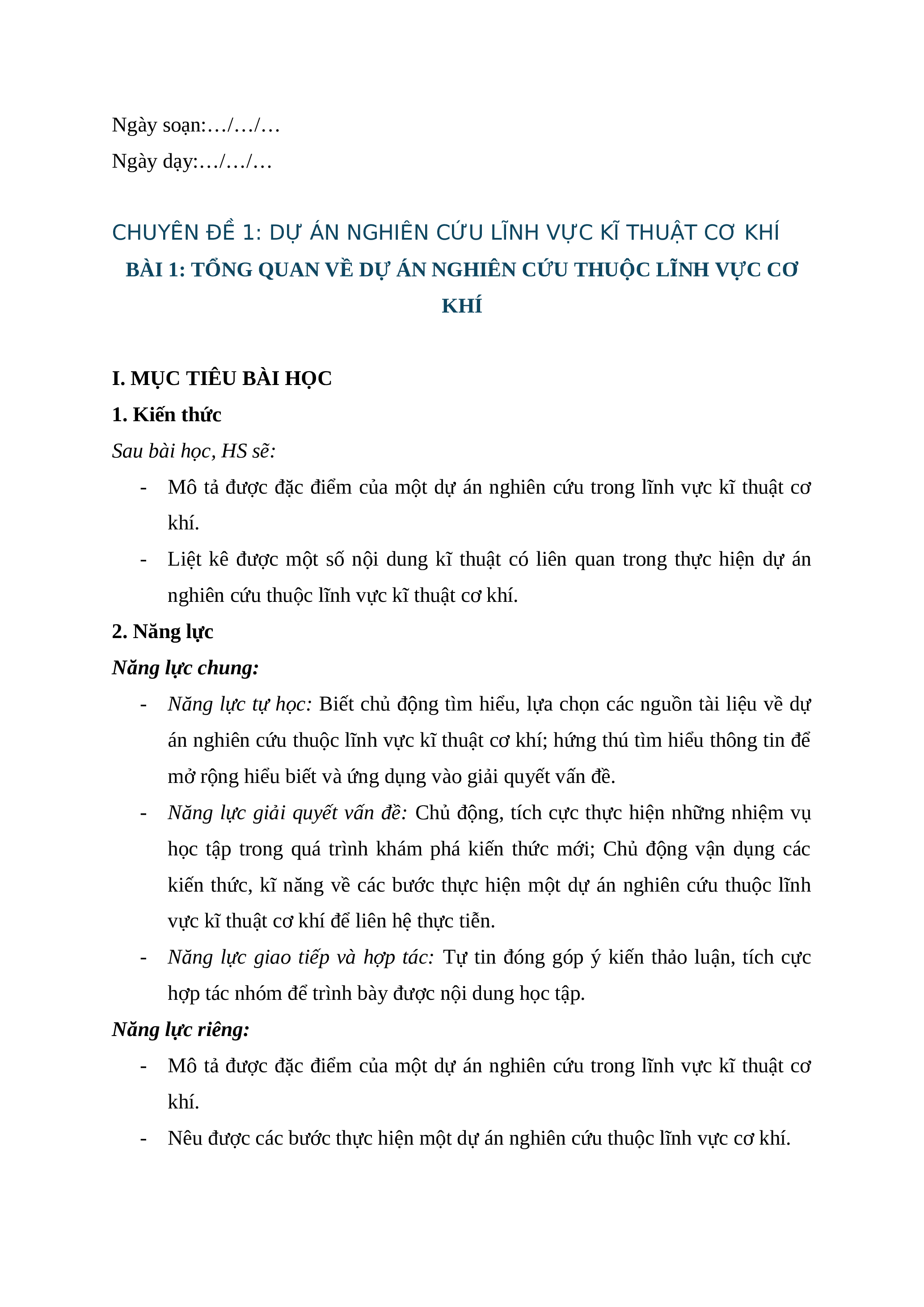 bài học ngày hôm nay: Bài 1: Tổng quan về dự án nghiên cứu thuộc lĩnh vực cơ khí.