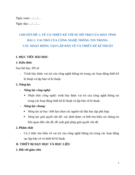 Giáo án chuyên đề Bài 1: Vai trò của công nghệ thông tin trong lập bản vẽ và thiết kế Công nghệ thiết kế 10 Kết nối tri thức