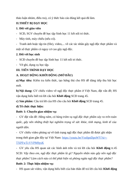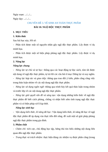 Giáo án chuyên đề Bài 10: Ngộ độc thực phẩm Sinh học 11 Kết nối tri thức