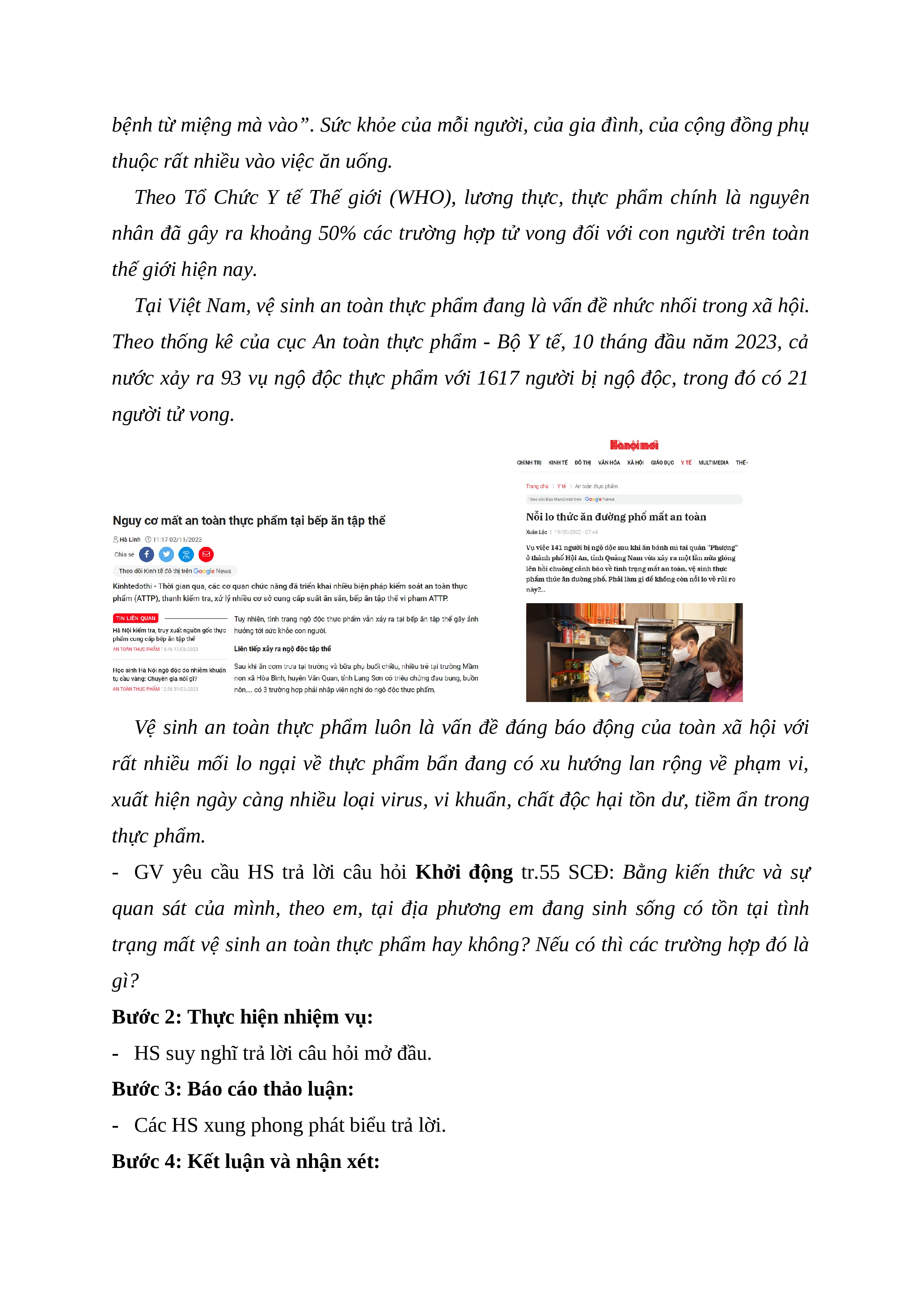 - GV đặt vấn đề về hiện trạng mất vệ sinh an toàn thực phẩm: Dân gian có câu