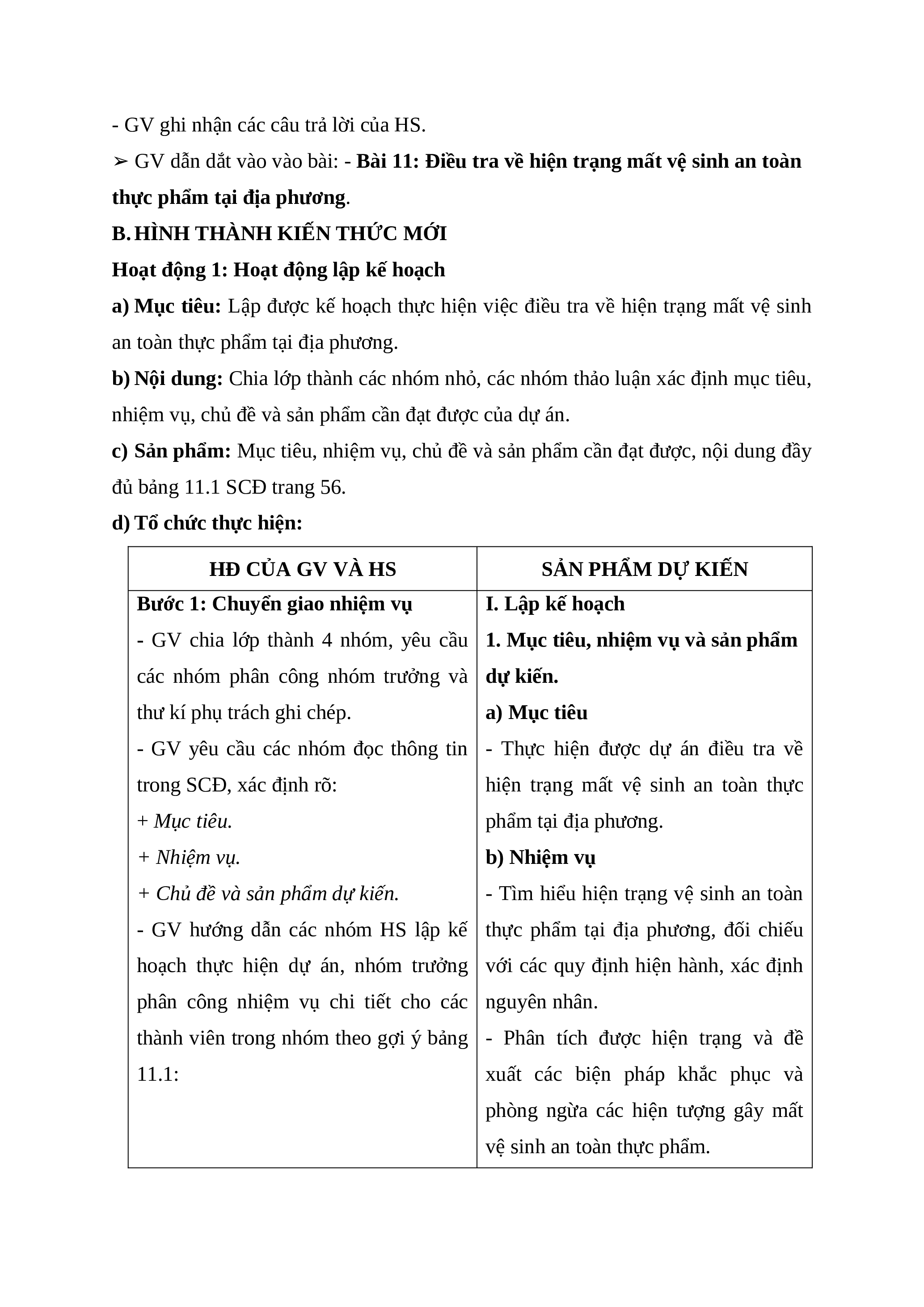 ➢ GV dẫn dắt vào vào bài: - Bài 11: Điều tra về hiện trạng mất vệ sinh an toàn