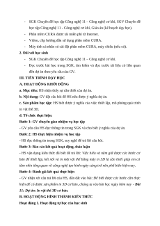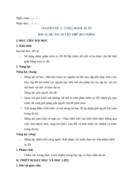 Giáo án chuyên đề Bài 11: Dự án In vật thể 3D cơ bản Công nghệ cơ khí 11 Kết nối tri thức