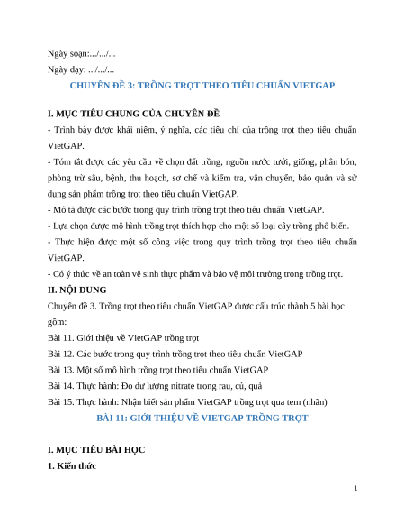 Giáo án chuyên đề Bài 11: Trồng trọt theo tiêu chuẩn Vietgap Công nghệ trồng trọt 10 Kết nối tri thức