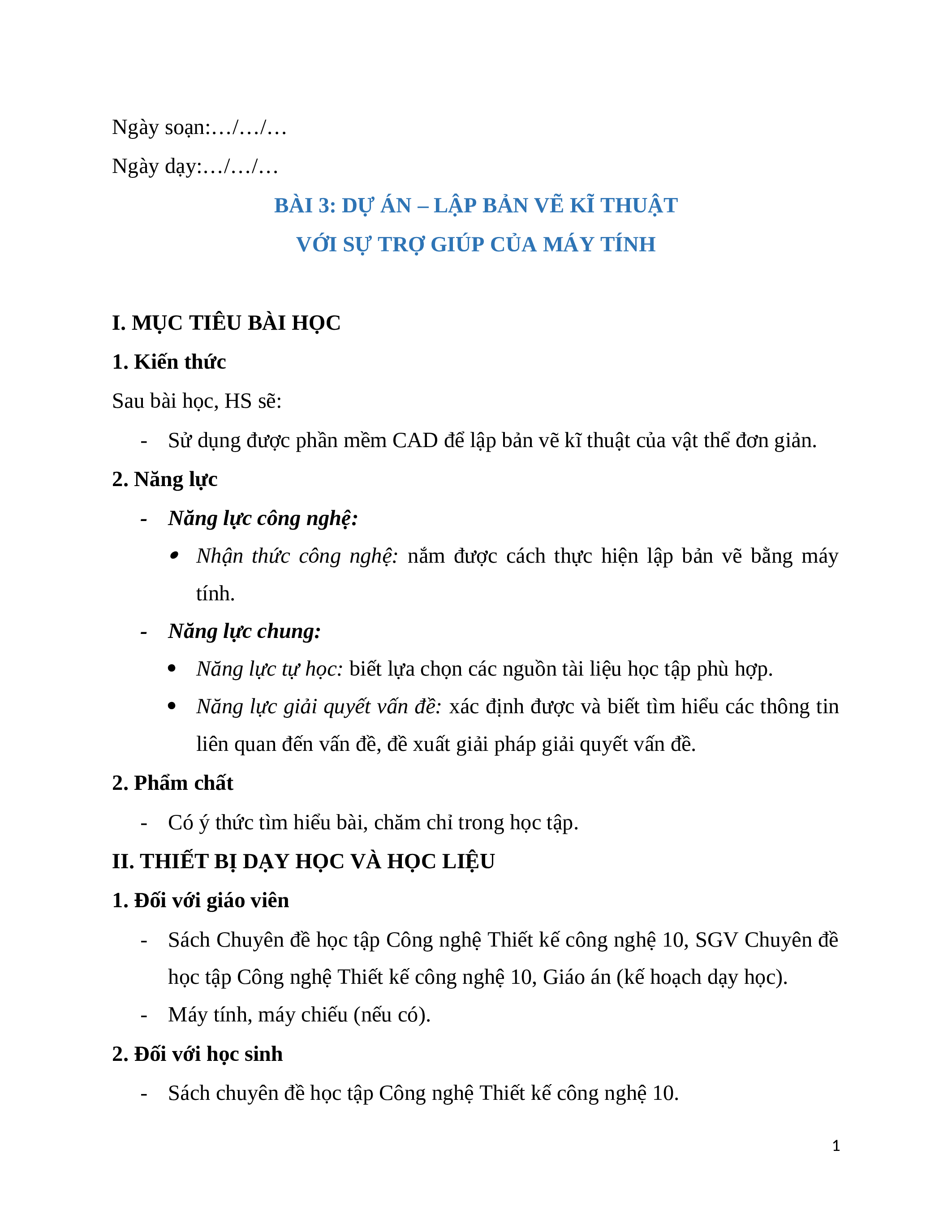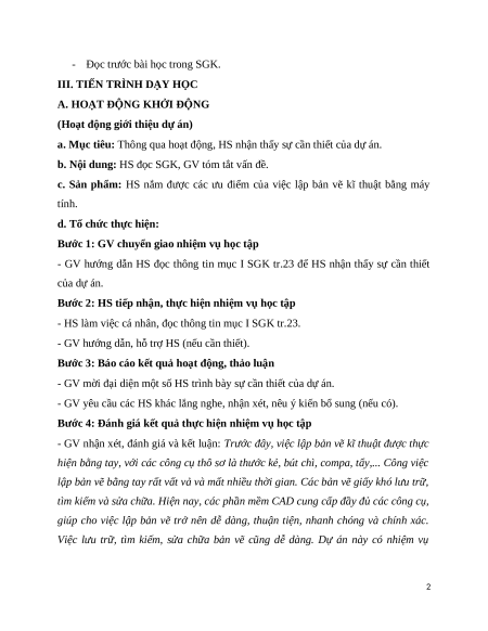 Giáo án chuyên đề Bài 3: Dự án lập bản vẽ kĩ thuật với sự trợ giúp của máy tính Công nghệ thiết kế 10 Kết nối tri thức
