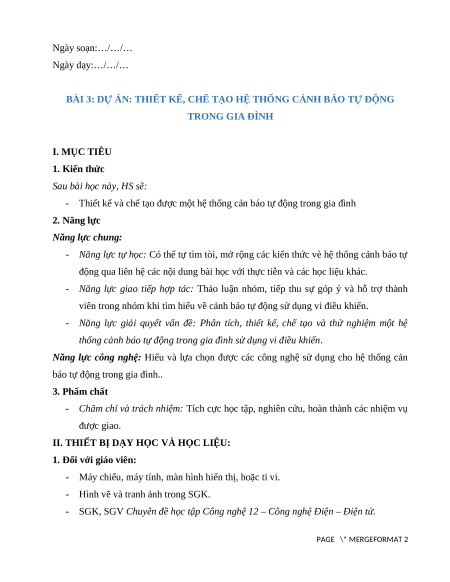 BÀI 3: DỰ ÁN: THIẾT KẾ, CHẾ TẠO HỆ THỐNG CẢNH BÁO TỰ ĐỘNG TRONG GIA ĐÌNH I. MỤC TIÊU 1. Kiến thức