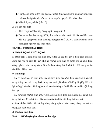 công nghệ vi sinh trong sản xuất phân bón, đồng thời kích thích HS mong muốn tìm hiểu bài học mới. b. Nội dung: