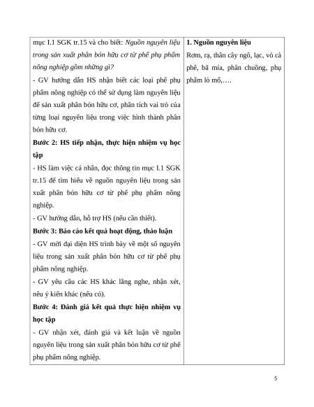 c. Sản phẩm: HS ghi được vào vở quy trình sản xuất phân bón hữu cơ từ phế phụ phẩm nông nghiệp.