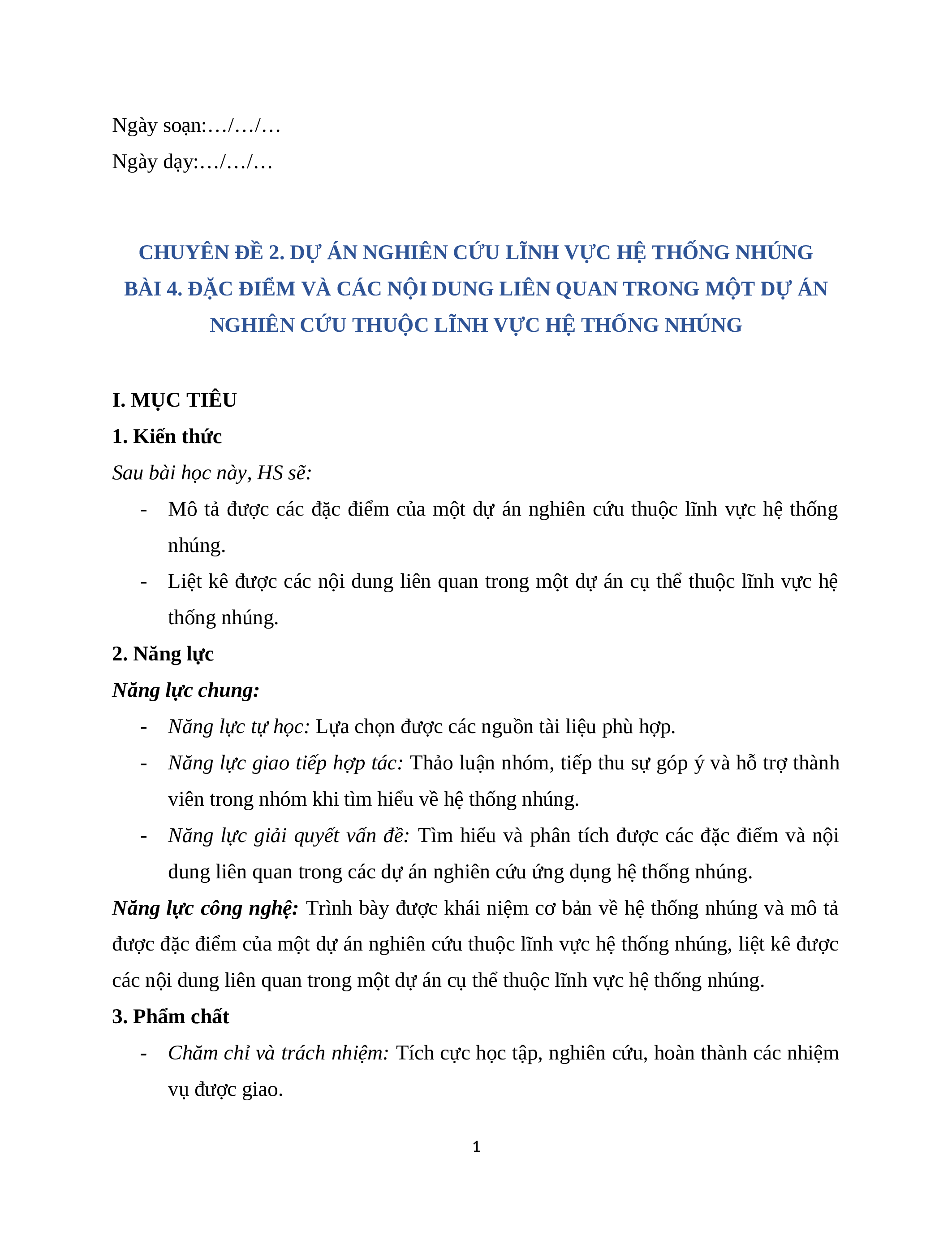 Giáo án chuyên đề Bài 4: Đặc điểm và các nội dung liên quan trong một dự án nghiên cứu thuộc lĩnh vực hệ thống nhúng 12 Kết nối tri thức