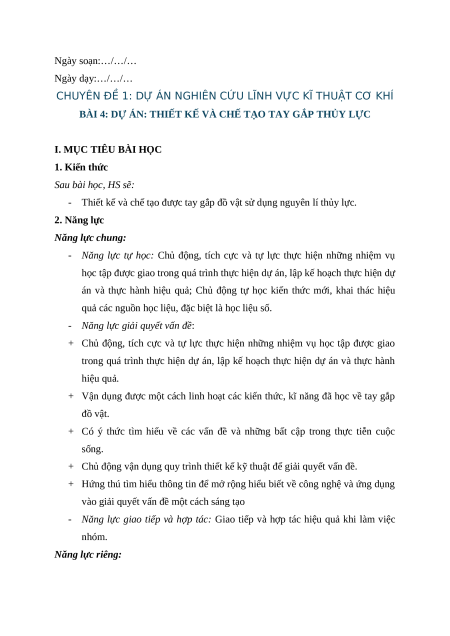 Giáo án chuyên đề Bài 4: Dự án Thiết kế và chế tạo tay gắp thủy lực Công nghệ cơ khí 11 Kết nối tri thức