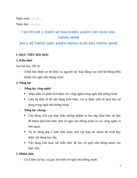 Giáo án chuyên đề Bài 4: Hệ thống điều khiển trong ngôi nhà thông minh Công nghệ thiết kế 10 Kết nối tri thức