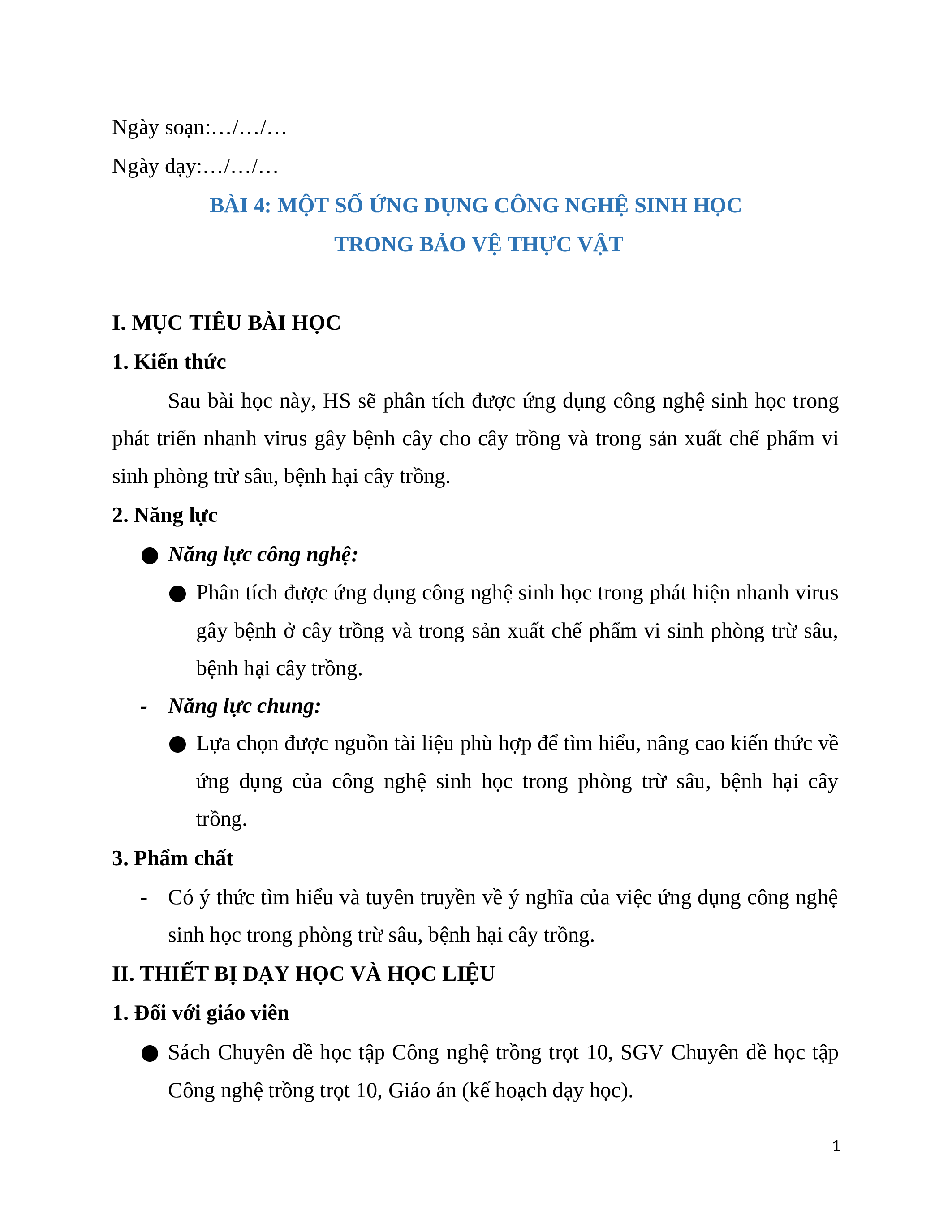 Công nghệ trồng trọt 10, Giáo án (kế hoạch dạy học). 1